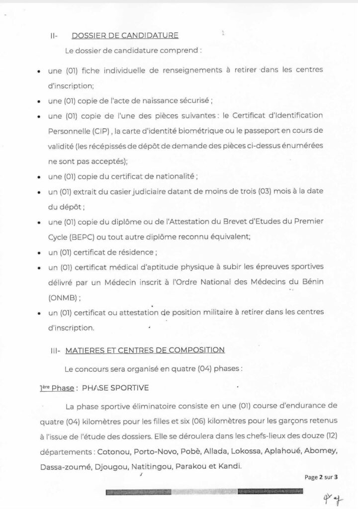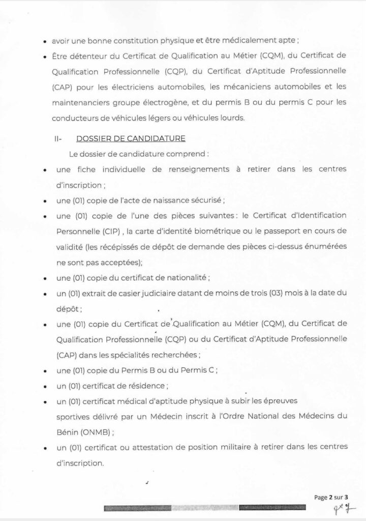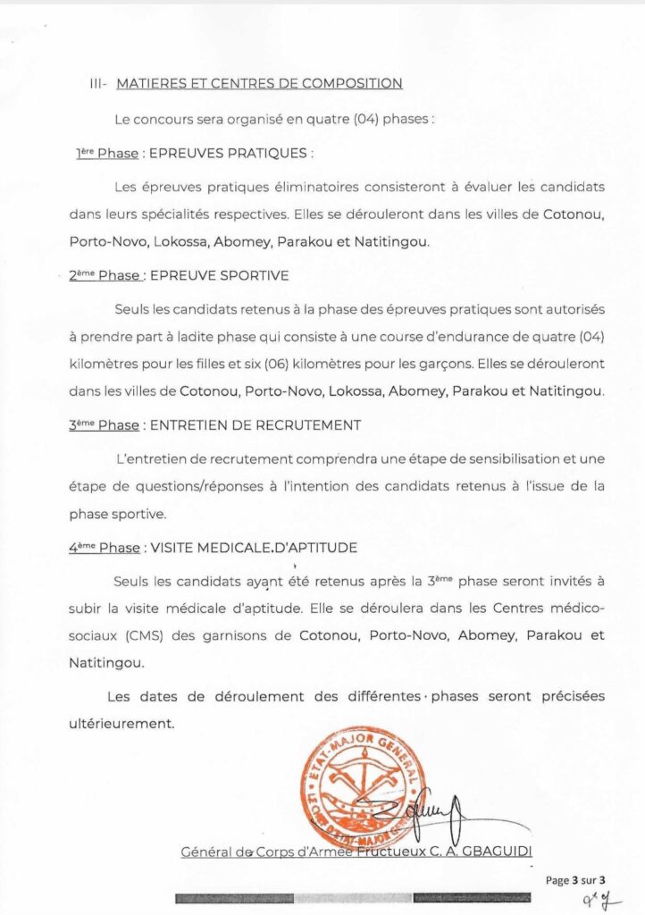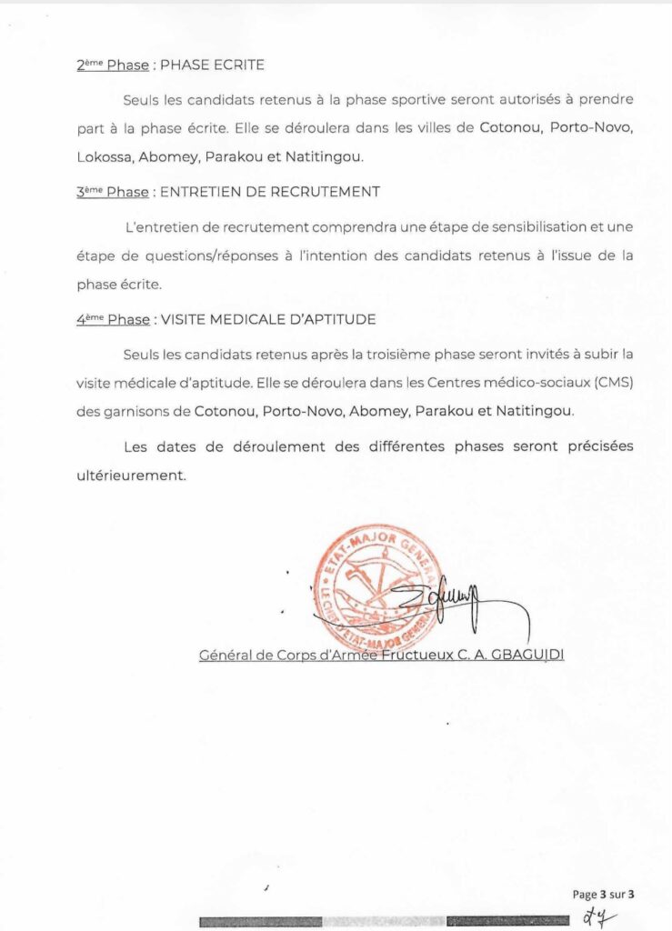 Le Chef d’État-major général des Forces armées béninoises annonce l’organisation de deux concours de recrutement au titre de l’année 2026 afin de renforcer les effectifs de l’institution militaire. Le premier vise l’intégration de 750 jeunes par voie de concours militaire, tandis que le second concerne le recrutement sur titre de 100 spécialistes répartis dans plusieurs domaines techniques. Les candidatures sont ouvertes du 19 janvier au 6 février 2026 dans l’ensemble des préfectures du pays.